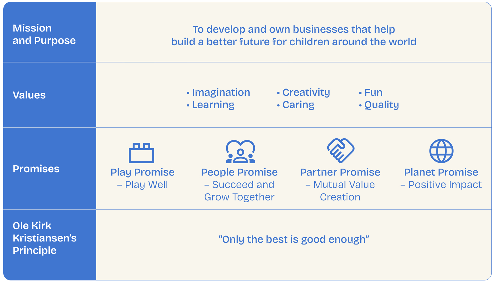 To this day, all businesses owned by the Kirk Kristiansen family are rooted in a core set of values. When welcoming new team members, we look for people who will thrive, grow with and contribute to our value-based culture.